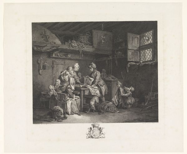 Adriaen van Ostade created this etching, "The Breakfast," sometime in the 17th century. The composition crams several figures into a rustic interior, all rendered with dense, cross-hatched lines that create a rich, almost claustrophobic space. The eye is drawn to the central cluster of figures gathered around a table, their forms defined by contrasting light and shadow. Ostade's technique here calls into question traditional ideas about perspective. The compressed foreground flattens the image, while the sharp lines of the architecture behind them give the space a chaotic feel. This print destabilizes conventional artistic categories by depicting everyday life. The image reflects the changing values of the time, emphasizing the importance of the local and commonplace in art. "The Breakfast" reminds us that art is not confined to high ideals or grand narratives but can be found in the detailed observation of daily life.