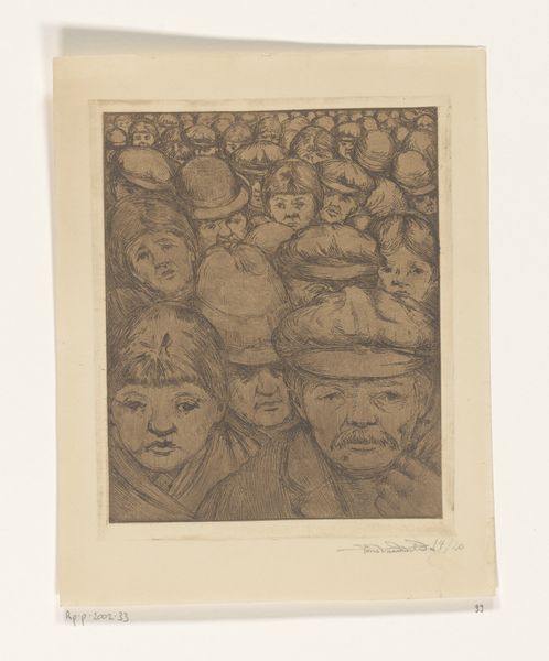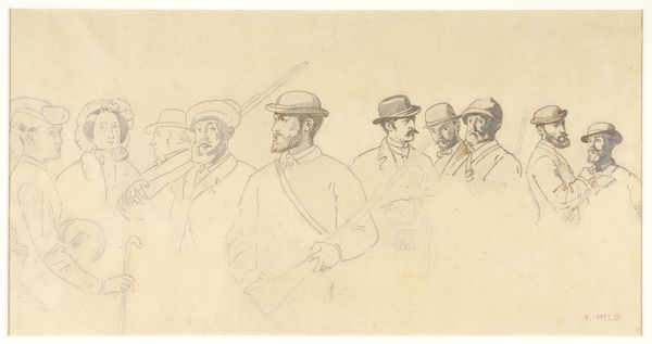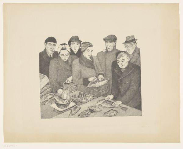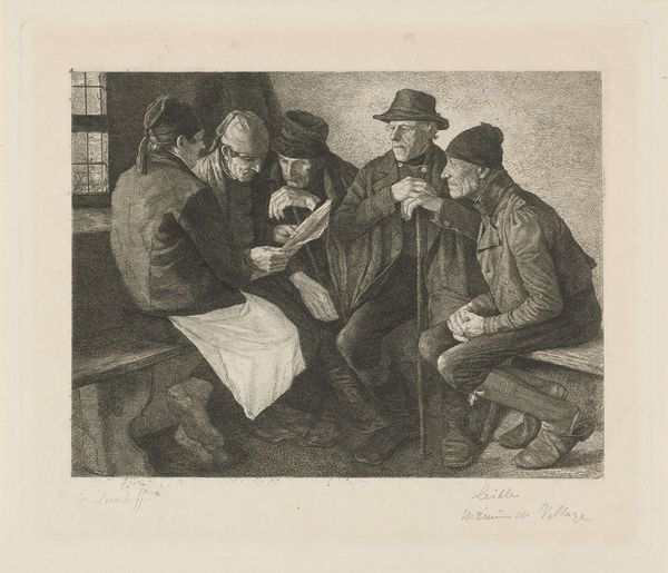 This black and white illustration, "Askeladden og de gode hjælpere", is a small print held at the SMK. Its anonymous creation speaks to the way folklore and fairy tales often emerge from collective cultural consciousness, rather than a single authorial voice. The image depicts a gathering of figures, their expressions ranging from stoic to curious, as a man reads from a document. The individuals are wearing traditional clothing, suggesting a community rooted in specific cultural practices. The visual language evokes a sense of shared identity and collective experience, hinting at the significance of oral traditions in shaping communal values. Notice how the artist captures a moment of communal engagement? It reflects the role of storytelling in creating a sense of belonging and cultural continuity. The lack of individual identity of the artist allows the illustration to transcend personal authorship, embodying the spirit of folklore itself.