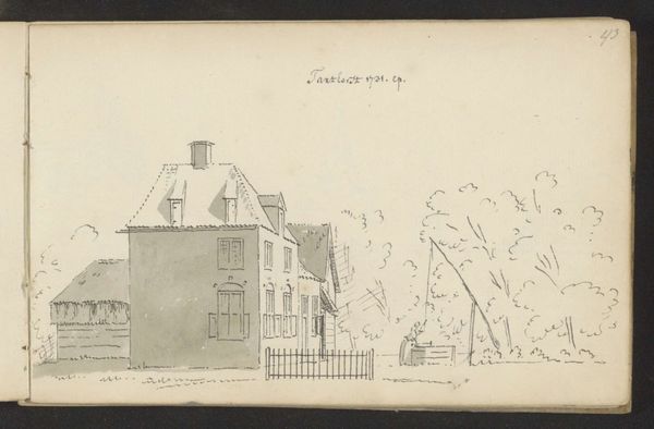 Curator: Here we have a drawing attributed to Cornelis Pronk, likely made sometime between 1701 and 1759, titled “Bouwwerk te Maasbommel.” It’s done in ink on paper and currently resides here at the Rijksmuseum. Editor: My initial impression is one of quiet domesticity. The scene is simple, rendered in muted tones. It feels like a captured moment, unassuming, yet somehow…endearing. Curator: For me, the most interesting aspect is how the artist employs line and wash to depict a commonplace structure. The strokes are quite economical, but they efficiently define form and suggest material—note the variations in ink density giving texture to the roofs and trees. Consider also the social context here; is this a commission meant to document this building or reflect a form of leisure in consuming landscape views? Editor: I find it compelling how the architecture seems organically integrated with its natural surroundings. You mentioned commissioning; the positioning definitely reads as idealized and bucolic. We must remember the fraught landscape of Dutch colonialism during this era and the cultural appropriation that underpinned a longing for simplicity that often masked violent power dynamics in the colonies. Curator: Exactly, and the medium reinforces this reading: paper as a commodity from particular production sites, and the skilled labor required to render it – these contribute to the narrative of how such views become not only aesthetically pleasing but also culturally loaded objects. The work's composition and placement speak volumes about its economic and societal function. Editor: The seemingly 'naive' rendering might intentionally evoke a sense of authenticity and innocence. Was this circulated as part of larger commentary regarding society? Could the portrayal of daily life itself been subversive during periods of conflict? And of course, who was this intended audience? These visuals normalized particular social frameworks; it speaks to art's role in cultural reinforcement. Curator: I’d add that examining similar drawings in Pronk's catalog reveals that these "genre paintings" were often preparatory studies, intended for larger, more elaborate projects… mass production that might speak to expanding commercial opportunities during that era. This detail provides context in which this piece functioned within an elaborate artistic enterprise and labor structure. Editor: Considering the themes we have identified allows us to scrutinize what role images like this assumed across political and gendered boundaries – questioning notions surrounding national and individual identity during this period. Thanks to this dialogue, what initially struck me as picturesque gains more complex political undercurrents. Curator: Yes, from analyzing materials to considering social and political histories, one understands the deep significance embedded even within what appears like the most understated scene.