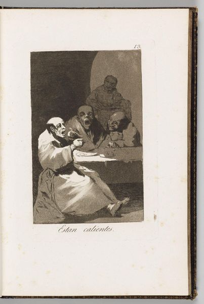 Curator: This print, titled "It's Hot!" is attributed to Francisco José de Goya y Lucientes and is held in the Harvard Art Museums. The scene is dominated by figures in robes, seemingly in distress. Editor: The tonal range is fascinating; the deep blacks contrast sharply with the bright whites, creating a sense of drama and discomfort. Curator: Indeed. The inscription translates directly from the Spanish, “They are hot.” The image is thought to be one of Goya’s many satires on monastic life. Editor: Look at the angular lines defining the faces. Notice how Goya uses hatching to build volume and texture. It really emphasizes their intense, almost grotesque expressions. Curator: The exaggerated reactions may point to a commentary on gluttony, or even the Church's complicity in social injustices of the time. Editor: It's a masterclass in using line and form to convey raw emotion. Curator: Absolutely. Goya's work provides a window into a complex social and political world. Editor: And aesthetically, his stark compositions continue to challenge our perceptions.