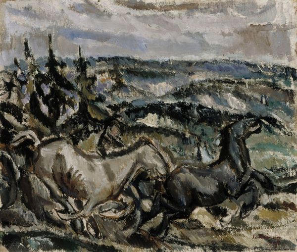 Cyprián Majerník's 'Runaway Horses' is, as far as I can tell, undated, and was painted using oil on some kind of support. There's an urgency in this work, a real sense of immediacy. You can almost feel Majerník wrestling with the paint, trying to capture the restless energy of these animals. Look at how he's built up the surface, thick strokes of browns and grays, with little pops of orange peeking through. It's all very physical. I mean, you can practically trace the movement of his hand across the canvas. Notice that line running down the back of the horse on the right? It's not just a line, it's a whole history of touch, a record of Majerník's process. This piece reminds me a little of Franz Marc, that same intensity and interest in animals, but Majerník brings his own particular sensibility. It's all about feeling, about intuition, about letting the paint lead the way. It's a painting that reminds us that art is a conversation, a back and forth between the artist, the medium, and the world.