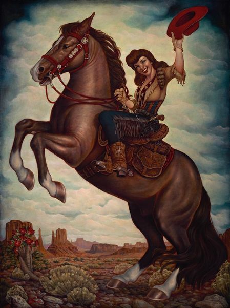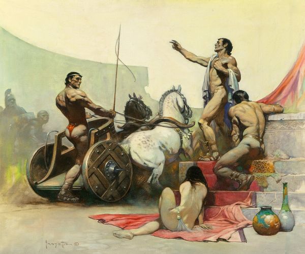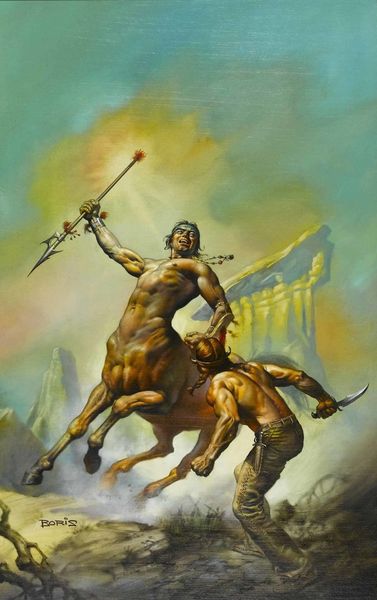 Editor: This is Jacek Malczewski's "Adoration of Madonna," painted in 1910. It’s an oil painting, and it strikes me as a really odd mix of the sacred and the profane, almost unsettling. There's a lot going on. What do you make of it? Curator: Unsettling is the perfect word! Malczewski, he wasn't afraid to stir the pot. See how he’s placed the Madonna, that symbol of pure reverence, on top of this…well, it’s a bit of a pagan altar, isn't it? There's an offering there of the horns of the bull that seem to be supporting the Madonna? What do you notice about the figures surrounding the base? Editor: There are satyrs… and some almost grotesque creatures. A man, looking away, in shadow almost kneeling, wearing what looks like a travelers robe. What are these creatures doing in the same space as a Madonna and child? Curator: Exactly! This is Malczewski diving deep into the Polish soul, this is! Remember, Poland at the time was partitioned, fighting for its identity. It's as though Malczewski's is wrestling with what is a real history and the longing for independence against tradition. He is posing a question, can a pure vision, that ideal of the Madonna, triumph over the pagan past? The satyrs, the grotesqueries - those are those parts of our selves we're tempted to keep secret, those are our shadowed identities. Is the future built upon the past? Does it replace the past? This piece isn’t just about the Madonna; it’s about us. Editor: Wow, I never would have pieced all that together from just looking at it! Curator: Art is the conversation, isn't it?