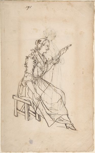 Curator: Just lovely. It feels so light, so fleeting. A whisper of a moment captured in pencil. Editor: It reminds me of a memory half-forgotten, emerging from the shadows. This is Otto Scholderer's "Woman playing the mandolin," from around 1879, now residing at the Städel Museum. It's a delicate pencil drawing on paper. What do you make of the subject, knowing that context? Curator: Oh, mandolins. Always carrying that slightly melancholic, almost whimsical weight. I can almost hear the faint echo of a tune that never quite resolves itself. And look at the way he's captured the fall of the light on her dress. It's a study in impermanence, isn't it? A moment she will never relive. Editor: Absolutely. The mandolin itself, beyond its sound, has its own iconography. Often associated with serenades, with longing, and the expression of emotions difficult to articulate otherwise. The pose and expression add to it... slightly withdrawn. What emotions does that bring forward for you? Curator: A certain vulnerability. Like she's pouring her soul into those notes, but only for herself. It's intimate, isn’t it? Not performative at all. It feels deeply private, which gives the work as a whole such an endearing charm. Editor: There's that sense of Romanticism there—a longing for an idealized past, reflected in both the style of dress and the artistic approach. It’s as though she’s plucked straight out of a poem from a simpler, maybe more genuine time. What else calls your attention here? Curator: The sketchiness itself is powerful. It embraces imperfection. It makes you realize the beauty is sometimes in the suggestion, not the complete rendering. What's *not* there allows the imagination to dance, to invent its own melody. And to imagine the story surrounding it. Editor: I agree; the incompleteness almost makes the symbol even more vibrant, filling the empty spaces with the viewers own lived history. These visual shorthands allow us all to complete the piece based on our own histories. Curator: Exactly! It’s like Scholderer handed us the bare bones of a dream and then simply whispers, “Go on, you tell it.” And we do, don't we? Editor: Beautifully put. It goes to show how even in the quietest sketches, some deep stories can come out to reveal a much bigger picture.
