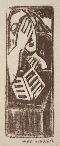 Curator: This woodcut by Max Weber, entitled "Study," was created between 1919 and 1920, embodying the themes of figuration characteristic of Expressionism. What’s your initial response to this compelling image? Editor: Overwhelming oppression, perhaps, or immense grief. The figure’s face is obscured by a hand, as if shielding themself from something unbearable. The stark contrasts of the print amplify that feeling. Curator: Indeed. Note the deliberate use of negative space. The bold lines and sharp angles generate a sense of unease and inner turmoil. How might this stylistic approach speak to broader social or political currents? Editor: Knowing this was created shortly after World War I, the work seems a direct response to the trauma of the conflict. Perhaps this shielding gesture also represents the act of "blinding" one’s self to horrific facts. Consider, too, how Weber, an immigrant artist, likely navigated complicated dialogues around national identity during a period defined by conflict. Curator: The figure holds what looks like a barred book. Can we read into this a possible conflict? Or the sense that access to truth is restricted during traumatic periods? Editor: Absolutely. This composition evokes a powerful image of suppression. Whether this relates to gender inequality, censorship, or racial marginalization is debatable. Weber gives us an image open to multiple interpretations based on what each viewer brings to it. Curator: Focusing more closely on the composition, notice the lack of a clear, coherent background, which amplifies the sense of isolation surrounding the figure. We feel a psychological intensity from it. Editor: From an activist’s perspective, this is more than a formal arrangement; this piece serves as an artifact capable of eliciting deep conversation concerning the consequences of trauma and resistance. Curator: This brief "Study," then, presents both technical and conceptual complexities. Editor: Indeed. This artwork makes a claim against enforced ignorance. We need images like this in spaces that create safe dialogues.