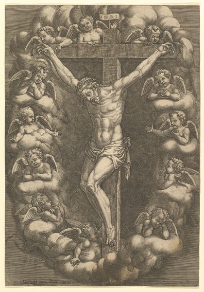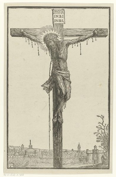 This small print, Christus aan het kruis, was made by an anonymous artist using the intaglio process of etching. The image is defined by crisp, precise lines incised into a metal plate, which would have been inked and pressed onto paper. The etcher would have covered the plate with a waxy ground, drawn the image with a sharp needle, and then bathed the plate in acid. The acid bites into the exposed lines, creating grooves that hold the ink. This process allows for intricate detail and subtle gradations of tone, seen here in the delicate rendering of Christ's body and the surrounding landscape. The work resembles engraving, but etching, requiring less force, allowed for a more expressive, freehand approach. The cultural significance of this print lies in its accessibility. Unlike unique paintings or sculptures, prints could be reproduced and distributed widely, making religious imagery available to a broader audience. The labor involved in producing the plate was considerable, but the resulting prints were relatively affordable, reflecting a shift towards mass production and consumption of art. By understanding the materials and processes involved in creating this print, we can appreciate its role in disseminating religious ideas and shaping popular culture.