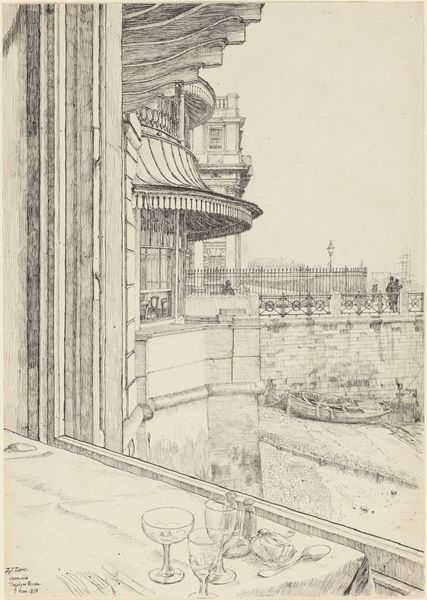 Curator: James Tissot's etching, "Trafalgar Tavern, Greenwich" captures a scene with intriguing depth. Editor: The mood is somber, a quiet observation through the lens of a rainy day. The foreground's table setting hints at untold stories. Curator: Notice how Tissot contrasts the detailed foreground with the blurred background, creating a distinct separation of space. The column on the left is rendered with strong vertical lines, anchoring the composition. Editor: The tavern itself, seen from within, projects images of 19th-century life and leisure. The river carries narratives of commerce, travel, and even empire, doesn't it? Curator: It's the interplay of light and shadow, the textures achieved through etching that command attention. See how form emerges through the manipulation of line and tone. Editor: Indeed, a fascinating view framed in a single print. The details and symbols invite so many interpretations.