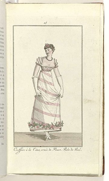 This fashion plate from March 1809 presents an ideal of feminine elegance, showcasing a dress adorned with floral motifs. Roses, both at the bosom and hem, are emblems of love, beauty, and youth, echoing classical ideals. The gesture of the woman's raised hand, gloved and graceful, is reminiscent of figures in Renaissance paintings, where such poses signified noble bearing and virtuous conduct. The gentle curve of her arm mirrors the 'contrapposto' seen in ancient sculptures, a pose that suggests a balance between action and repose. Think of Botticelli's Venus, whose gestures exude a similar grace. Such gestures tap into a collective memory, a cultural inheritance that speaks of harmony, decorum, and the idealized female form, even as fashion evolves and reinvents itself. It's a powerful assertion of cultural continuity, demonstrating how symbols persist, adapt, and resurface across the epochs, engaging us on an emotional level with their familiar yet ever-changing language.