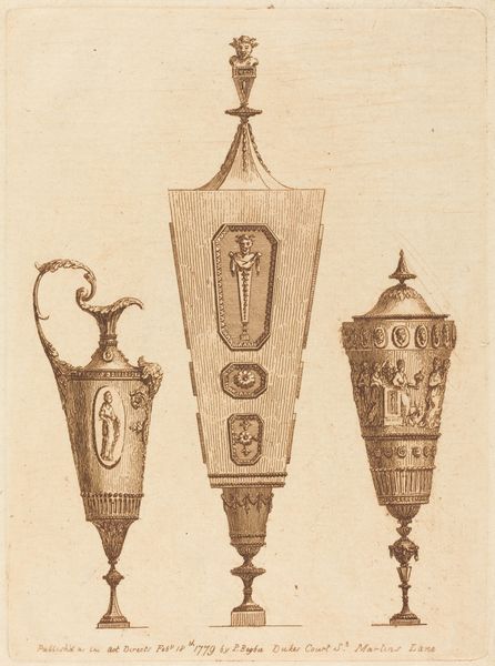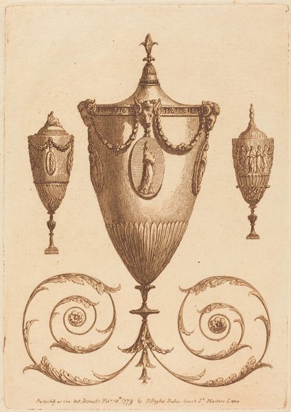 Patrick Begbie rendered this print, titled "Three Classical Vases, One with Garlands," in 1779. The sepia-toned engraving reflects the 18th-century fascination with classical forms, which became a visual language of power and taste. Consider the era in which Begbie lived, one where decorative arts became markers of social distinction. These vases, with their intricate garlands and classical motifs, speak to the aspirations of a society seeking refinement. But who did this refinement serve? How did the labor and materials required to produce such objects impact those outside the aristocratic circles? Begbie's print invites us to consider not just the beauty of these objects but also their place within the broader social fabric of the time. It's a poignant reflection on aesthetics, identity, and the subtle ways in which objects embody our desires and values.