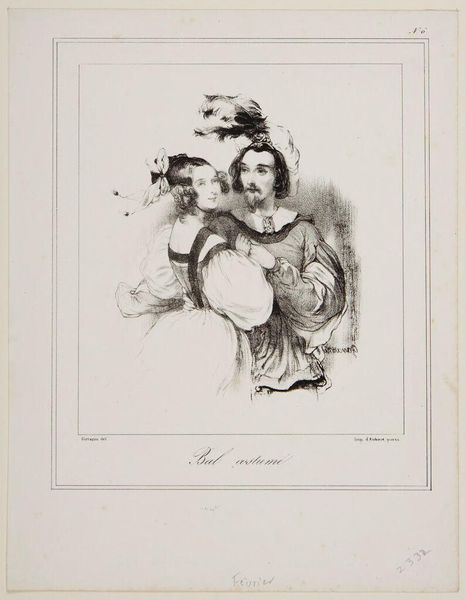 Editor: This is Paul Gavarni's "Departure for the Ball." It looks like an ink drawing. I'm struck by the contrast between the detailed clothing and the sketchiness of the background. What catches your eye? Curator: I observe the linear precision, the distinct hatching that models the forms. Consider the use of line to define texture, from the woman's dress to the man's coat. How does this precise mark-making inform your understanding of the subjects' social standing? Editor: I hadn't thought about that! It makes the figures seem more refined, almost aristocratic. Thank you for pointing that out. Curator: Indeed. It is through such visual language that Gavarni communicates societal nuances, isn't it?