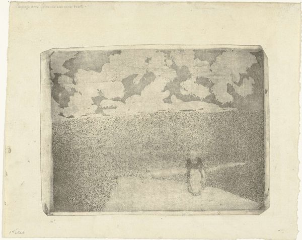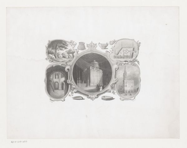Editor: This is a monochromatic etching and drawing from between 1800 and 1860, entitled "Rivierlandschap met een brug en een windmolen," or "Riverscape with a Bridge and a Windmill," by an artist only known as Monogrammist EG. The image is petite and contained within a kind of vignette. It has a quaint, old-world feeling. What do you make of it? Curator: It's as if Monogrammist EG is inviting us to peek through a looking glass into a simpler time. The composition, though modest in scale, brims with an understated romanticism, wouldn't you agree? It evokes a sense of nostalgia, of longing for a rural idyll where life moved at the pace of the turning windmill. I wonder, does it feel "real" to you, despite its obvious charm? Editor: I do find it charming, yes! But you're right, there's also something quite constructed and composed about the image. Maybe that's the Romanticism coming through? Curator: Precisely! The artist isn't just depicting a landscape, they're curating a feeling. See how the monochrome palette simplifies the world, allowing us to focus on texture and form? Almost like a memory gently fading. Editor: I hadn't thought of it that way, but it's true. The details aren’t sharp. It does feel a bit like recalling something from long ago. Curator: Consider also how the bridge, a symbol of connection, bisects the composition. It invites us to cross over, to step into this constructed reality. Does it feel welcoming or somehow… distant? Editor: Now that you point it out, I see a bit of both. It’s intriguing! It seems I only scratched the surface at first glance. Thanks! Curator: And thank you. It’s always a joy to discover new nuances through the eyes of another.