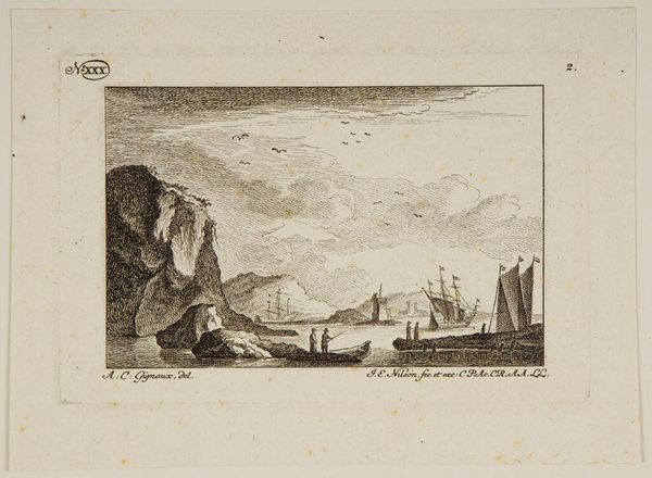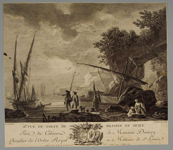 Curator: Francesco del Pedro's "Fishermen on the Shore" presents an interesting case study in artistic labor. The etching, a reproducible medium, democratizes the image, making it accessible beyond the elite. Editor: I'm struck by the sepia tones and the groupings of figures. What do you see in this piece? Curator: Beyond the picturesque scene, consider the production of this print. Who was the intended consumer? Was it merely decorative, or did it serve a broader social function in shaping perceptions of labor and leisure? Editor: That's a helpful way to think about it. The context shapes the content. Curator: Exactly. Examining the material conditions reveals hidden narratives within the art itself. Editor: Thanks, I'll never look at an etching the same way again.
