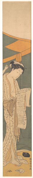 Curator: Here we have Suzuki Harunobu's "Woman Standing by Mosquito Net Reading Letter." Editor: It's immediately striking how the mosquito net itself is such a prominent structural element. The way the light hits it gives the scene a sort of dreamlike quality. Curator: Precisely. Harunobu, active in the 18th century, pushed the boundaries of woodblock printing, and this print showcases his mastery. Think about the cultural context—these images were widely circulated, shaping perceptions of beauty and domesticity. Editor: And how were these prints made? The labor involved is quite striking. Each color would need a separate block, meticulously carved and printed. It speaks volumes about the value placed on skilled craftsmanship. Curator: Yes, and the print's intimate scale suggests a personal, almost private moment, yet it was designed for public consumption. It's a fascinating tension. Editor: I agree. Considering the labor and materials, owning such a print would have signaled a certain level of economic and cultural capital. Curator: Indeed. Harunobu’s work gives us insight into the social and artistic currents of his time. Editor: Seeing this through a lens of production and consumption really highlights the artist's talent and the work involved.