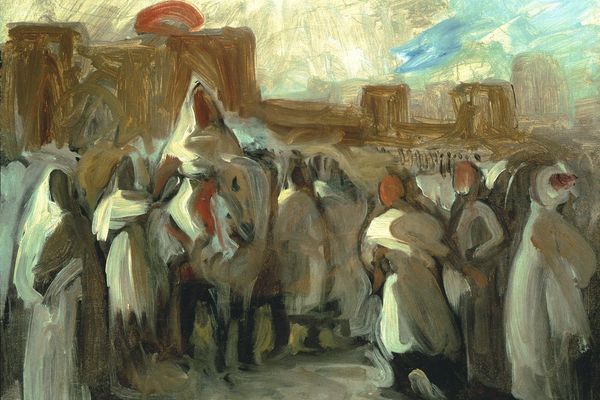 Curator: I see a flurry of earth tones. The ochre and russet shades lend a feeling of baked earth, immediately making me think of sun-drenched afternoons in some bygone Mediterranean locale. It's both captivating and, strangely, melancholic. Editor: Precisely. This detail is taken from Edgar Degas’s "Alexander and Bucephalus," completed in 1861. It’s an oil painting, and embodies the academic style—evident in its careful composition and focus on historical narrative. Curator: You know, "academic" always feels like such a sterile term. Look at how those figures in the background dissolve into the landscape! The tension between precision and looseness...it feels so human. So very, very Degas! Editor: True. We observe here an early engagement with movement and light. Semiotically, consider the obscured cityscape. It isn't about glorifying Alexander's conquest but about embedding the hero within the fleeting nature of time. Curator: He always was interested in things beyond traditional art back then. Did he maybe sense even this glorious moment in history was just…a blink? You know? Look, maybe he couldn’t have foreseen how it would impact everyone, but he had a deep personal need to get all this down as rawly and purely as possible—the feeling in the figures and horses is incredible. Editor: Degas constructs his painting with layering, contrasting light with shadows to give mass. We get a glimpse of something new from what others see as traditional, such as history or conquest paintings. Curator: I suppose it invites me to think, what details am I overlooking today, what quiet beauty might be escaping my notice, or maybe which people am I overlooking. Degas had his concerns back then, so do I now. Thanks for your careful way of seeing today. Editor: Yes, thanks for expressing those feelings. The detail reminds us that Degas’s works, in essence, ask the observer to reconcile past narratives with current sensations.