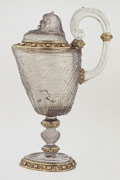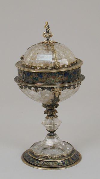 Curator: Oh, isn't this extravagant? A feast for the eyes! The shimmering clarity of the glass against the opulence of gold detailing, quite an effect. Editor: Indeed. We’re looking at a Double-spouted vase with cover. Its creation is attributed to Reinhold Vasters, dating sometime between 1865 and 1895. It currently resides here at the Metropolitan Museum. Curator: The duality is interesting. Two spouts suggest shared experience, conviviality. The Baroque revival style is undeniable—the sheer flamboyance, the undulating lines...it is very sculptural. Editor: Absolutely. The work speaks to the decorative arts flourishing during that period, catering to wealthy patrons seeking ornate pieces to showcase their status and refined taste. Pieces like this were status symbols. Curator: And the materiality! The glass appears almost weightless, yet those bold baroque curves hint at its inherent strength. It plays with transparency and reflection, inviting the eye to dance across its surface. And structurally speaking, that central column dividing the vessel is such an imposition and division. What purpose might that serve? Editor: It does seem almost...arbitrary. Vasters was known for his expert craftsmanship but also, let's say, his interpretations of earlier styles. Often, these 'revivals' reflected Victorian ideals of grandeur rather than a true connection to the historical period. The division of the vessel could symbolize anything from social divisions of the time to the idea of segregated substances kept apart in the same body, or just an affectation from the design that came down to him from others. Curator: It strikes me how that lid perches precariously, as if to say "all this excess is fleeting". A symbolic commentary on wealth's ephemerality, perhaps? Or maybe the artist's struggle to balance aesthetics with functional practicality. I see a dialogue happening here about tension, control, and spectacle. Editor: Fascinating interpretation! The vase certainly acts as an intersection between artistic expression, class consciousness, and technological advancements that influenced production in that time period. Its story then, might transcend aesthetics and delve into societal values. Curator: So while seemingly frivolous, its composition creates quite a multi-layered statement, historically as well as in design terms. I’m struck with how my initial perception, was merely an introduction to a deeper and ultimately valuable set of insights. Editor: Exactly. Considering how art becomes enmeshed with society reminds us to be wary of immediate or simple interpretations. This piece shows how form and function can, and do, speak volumes if we let them.