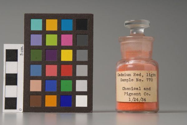 Editor: This intriguing piece, called "Dragon's Blood" by Madderton, features an old glass bottle filled with a red substance and an adjacent color chart. It's fascinating to see this material displayed. What can you tell me about this artifact? Curator: Well, focusing on the material aspects, we see a manufactured product, bottled and labeled. It makes me wonder about the social context of its production. Was this for alchemical practices, artistic use, or something else entirely? And how was "dragon's blood" sourced and processed by Madderton? Editor: That's really interesting, I hadn't considered the manufacturing aspect. Curator: The bottle itself, the label, even the pigment inside—all represent labor and consumption. Considering these elements shifts our focus from a purely aesthetic appreciation to an understanding of the commodity and its place in society. Editor: I see what you mean; it’s a product first, artwork second. Thanks for sharing your perspective!