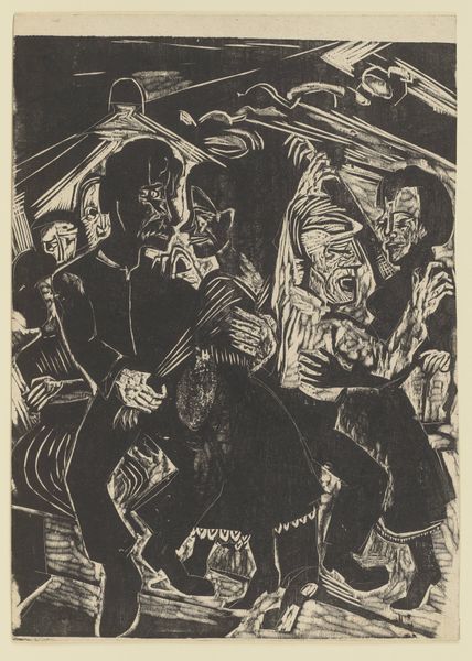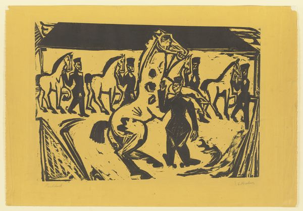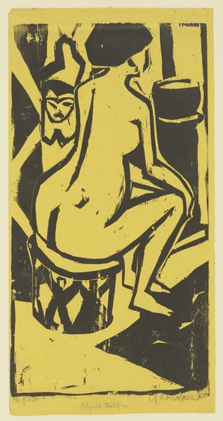 Curator: This arresting piece is Ernst Ludwig Kirchner's 1915 woodcut and linocut print, “Cocotte on the Street,” now residing at the Städel Museum. Editor: Whoa. Stark! And a little unsettling, right? Like a fever dream of sharp angles and clashing contrasts. I can practically hear the screech of brakes and hurried footsteps. Curator: Precisely. Kirchner's involvement in the German Expressionist movement meant grappling with urban anxieties in pre-war Germany. The term “Cocotte” itself situates the work in a landscape of commercialized sexuality. What you sense is not merely a portrayal of the city but a critique of its effects on individuals, particularly women. Editor: Critique, huh? I see what you're saying, with those mask-like faces and almost predatory poses. They remind me of fragmented puppets…lost in the machine. The color adds to the feeling—the stark yellows create such intensity. I feel nervous for her. Curator: Think about the socio-political context too, how societal pressures influenced his vision. These depictions challenge conventional bourgeois morality. Kirchner places women, especially those existing outside traditional roles, at the forefront. The stylistic choices here are very telling. He forces viewers to confront the commodification and alienation prevalent at the time. Editor: Wow. Heavy. It's kind of amazing how he can jam-pack all that history and angst into this tiny block print. It reminds me that artists see stuff…they feel stuff. Curator: Ultimately, Kirchner pushes us to think about who has the right to represent whom, and under what circumstances. Who benefits? These are pressing issues even now. Editor: Okay, I see it differently now! The yellow is the nervous energy, the black is what is holding her down...It gives me a lot to think about for my work, about what I can do in a single piece of work. Thanks!