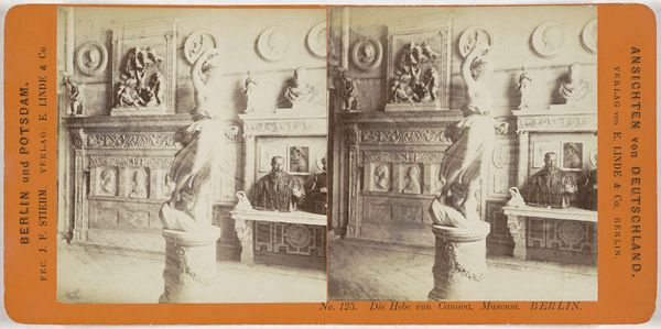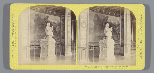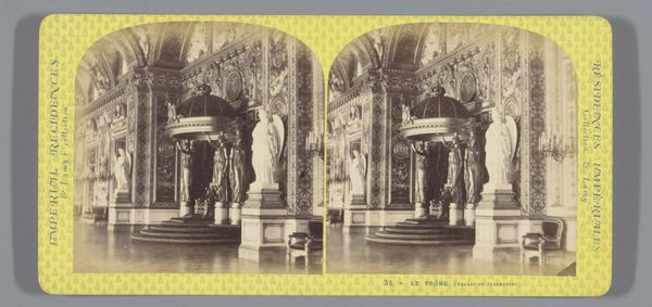This stereoscopic image captures a sculpture within the Salon de la Paix in the Palais des Tuileries, Paris, and was created by Ernest Eléonor Pierre Lamy. The photograph presents an intricate play of lines and forms, organized within a symmetrical composition typical of its era. Light and shadow define the contours of the sculpture, accentuating its texture and volume, creating a sense of depth and space. The interior's structural elements, such as columns and paneled walls, contribute to an overall feeling of classical order, while the mirrors reflect and extend the visual field, blurring the boundaries of the physical space. The careful arrangement of objects, coupled with a subdued tonal range, evokes a sense of calm. Lamy's choice of a stereoscopic medium enhances the viewer's perception, inviting a deeper consideration of how photographic techniques can shape our understanding of architectural and sculptural forms.