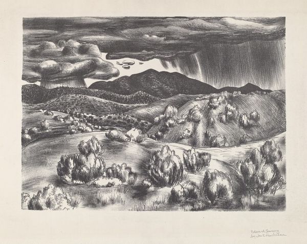 Editor: This is "Vitorchiano nel Cimino," a woodcut print by M.C. Escher, created in 1925. It depicts a striking landscape, almost otherworldly with its stark contrasts. There's something very geometrically satisfying about it. What stands out to you most when you look at this work? Curator: Oh, Escher, he always manages to twist perception, doesn't he? It’s like he's trying to capture the weight of history pressing down on this little Italian town. See how the village perches precariously atop that imposing rock formation? It reminds me of a stubborn thought you can't shake. I wonder, what do you make of the figure sketched beneath the tree in the foreground? Editor: I almost missed that! It’s so small, easy to overlook with everything else going on. I guess they’re admiring the view? Adds a human element to this otherwise monumental scene, maybe? Curator: Exactly! And it almost feels like Escher's putting *us* in that figure's shoes. The scale, the geometric carving – it’s as if we are miniaturized within this imposing vista, contemplating something much bigger than ourselves. It makes me feel, you know, both insignificant and somehow connected, all at once. Like the world is a complex puzzle, and we’re just one little piece. Does that resonate with you at all? Editor: It does, actually! It makes me think about how Escher's often associated with mathematical art, but there’s this deeply romantic sensibility at play too. The town seems impenetrable yet idyllic at the same time. I initially perceived it as purely geometric, but it offers this contrasting, serene feel. Curator: Serene, but also maybe a little…isolated? A fortress against time, perhaps. Editor: I never would have picked up on that subtext by myself, so, thanks! It makes this print way more evocative to think about how we observe art through our interpretations.