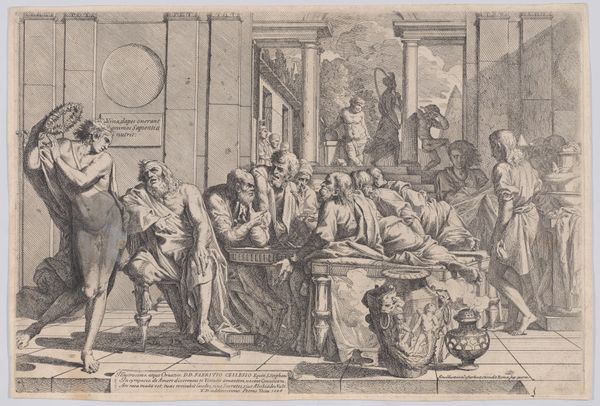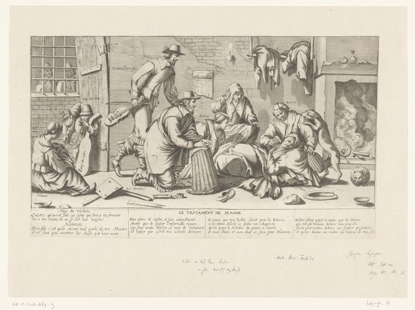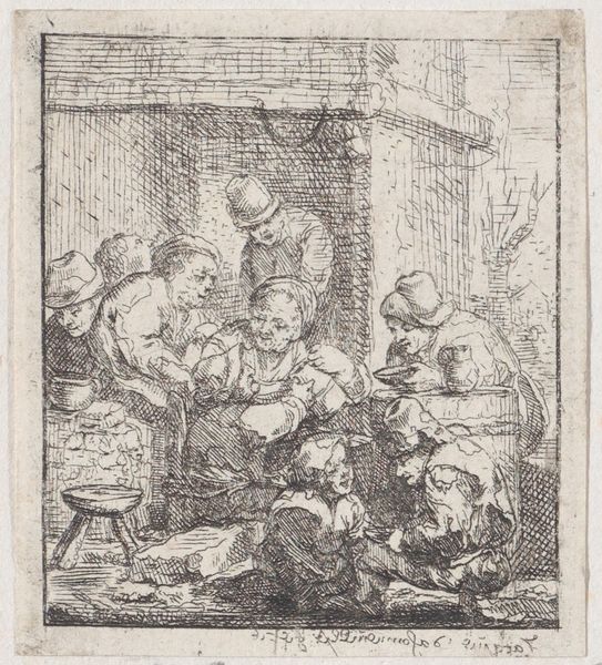 Editor: Here we have “Two Women with Children in a Kitchen Full of Foodstuffs,” an etching that’s estimated to be from between 1785 and 1823, currently held at the Rijksmuseum. It's brimming with all sorts of foods! I can’t help but feel overwhelmed looking at it. What do you see in this work? Curator: I see a carefully constructed depiction of labor and consumption. Consider the sheer quantity of food. Its acquisition and preparation required immense effort. What can you tell me about the etching technique used here? Editor: Well, etching is an intaglio process, so the lines are incised into the plate, right? All that detail must have taken forever to create! Curator: Precisely. And what does that say about the intended audience and the purpose of such a detailed rendering of domestic labor and material wealth? Editor: It seems aimed at those who either participated in or directly benefitted from that system of production, like a status symbol almost. Curator: Exactly! The print medium allowed for wider distribution than a painting. So how does that affect its social impact and cultural meaning? Editor: Mass production… That connects the artwork directly to economics, to markets for art and food and ideas about family. Curator: It shifts our understanding away from individual genius towards a collective participation in systems of value. Have your views on the work evolved? Editor: Definitely. I see it’s less about two specific women and more about the bigger, material conditions that shape their lives and our viewing experience. Curator: I agree, understanding its construction has given a new perspective of its artistic purpose and relevance.