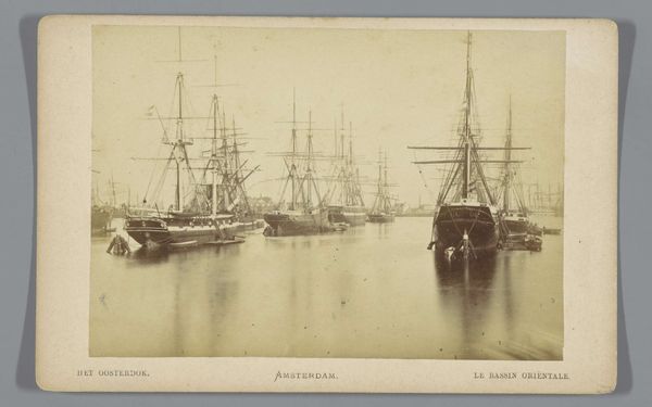 Editor: Here we have "Schepen in de haven van Málaga" by Jean Andrieu, made sometime between 1862 and 1876. It’s a gelatin-silver print photograph, and I find the composition to be incredibly dense. It's a cityscape but it's completely dominated by these massive ships and their rigging. What do you make of it? Curator: The beauty lies precisely in that density. Note how Andrieu has used the geometric lines of the masts and rigging to create a complex web that draws the eye upwards. It is a fascinating juxtaposition of organic and inorganic forms, a kind of organised chaos. Editor: Organised chaos - I like that description! But it’s also…flat. The foreground, middle ground, and background almost merge. Is that intentional, perhaps reflecting an interest in Japonisme? Curator: Precisely! The flattening of perspective, so characteristic of ukiyo-e prints, is evident here. Consider how the tonal range is deliberately narrow. Andrieu forgoes deep shadows and highlights in favour of a more uniform, ethereal light, contributing to this flattening effect. Editor: So it's not a flaw, but a choice, leaning into a particular style. Did the stereoscopic format also influence the final visual impression? Curator: A key question to explore, yes. This format enhances the sense of depth, inviting close inspection. However, it equally draws attention to the flatness of composition that we just examined. Editor: That’s fascinating; the stereoscopic view emphasizing flatness instead of depth. I had never thought of that. Thank you. Curator: Indeed. By embracing flatness within a form that otherwise implies three-dimensionality, Andrieu subtly disrupts conventional modes of perception. The photograph, in its way, becomes an exercise in deconstructing the illusion of reality.