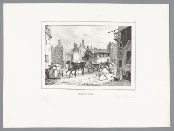 Victor Adam created this print, ‘Favorite’-omnibus wordt gepasseerd door een fiaker, sometime in the 19th century using etching techniques. The eye is drawn to the contrast between light and shadow, the way light reflects off the carriage, creating a focal point. The artist uses linear perspective, converging lines, to create depth, leading our eyes into the bustling street scene. The composition is carefully structured; the vehicles and figures are arranged to direct the viewer's gaze, with a visual rhythm and flow of movement. The print is composed of a delicate network of fine lines and intricate details. Adam’s mark-making reveals an interest in the material possibilities of etching. The artist’s skill with light and shadow not only defines the forms but also evokes a sense of atmosphere, of a moment captured in time. Consider how the formal elements of composition, line, and light function together to create a moment, inviting us to look closer and question what we see.