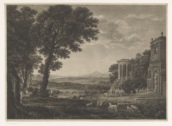 Editor: Here we have William Woollett's "Temple of Apollo," a print from the 18th century. I am drawn to the detail in the landscape. What do you notice about the printmaking process and how it informs our understanding? Curator: Notice the labor involved in creating such intricate lines, using tools to etch the plate. How does this material process affect the consumption and appreciation of the artwork, particularly within the context of 18th-century print culture? Editor: That's a very interesting way to consider it! Thank you! Curator: My pleasure; thinking materially offers unique insight.