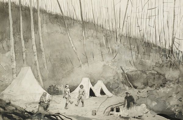 Curator: Let's turn our attention to "Pociąg," painted by Tadeusz Makowski in 1927. This piece, rendered in oil paint, presents a landscape featuring a train chugging along. Editor: Well, it feels a little melancholic to me. There’s something about the muted palette and bare trees that evokes a sense of stillness despite the train’s presence. Curator: Yes, I see what you mean. The bare trees against the sky can evoke certain somber feelings, yet train imagery has rich historical connections. Think about early 20th-century notions of progress and the burgeoning industrial era. Do trains here become a metaphor for societal advancement, but also represent an ecological price? Editor: Maybe, or perhaps the train isn't a symbol as such, but serves to emphasize the setting, which may have been logged or soon would be to expand its path? This painting does a strange kind of thing; there’s something innocent and dreamlike about it but it doesn’t completely wash over you in sentiment. What I mean is that innocence is a lens in Makowski’s creation, it’s a device but doesn't represent an emotional endpoint for viewers. The train sort of marches, like time. Curator: I understand your perspective, especially when we factor in elements like the bird perched amidst the trees—a detail that provides counterpoint or possibly even irony in tension. Bird in place of train? There’s this play between what is mechanized versus natural life forms and cycles within nature. Also note bundles on ground and tree logs—perhaps felled to make way for "progress". The composition directs viewers' gaze diagonally from water through bundles and up and across to trees/train. This way elements balance on this small canvas space. Editor: Absolutely! The inclusion of those logs along with the bird creates a really interesting tension and suggests a critique or at least questioning what "progress" really costs. So even though it presents as charming on first impression, the artist manages to imbue it with a little subtle cynicism. Curator: A fascinating painting and thoughtful discussion! The kind of piece that holds both charm and a slightly disquieting undertone, leaving a lasting impression, especially concerning what progress truly represents to us. Editor: I’ll definitely be thinking about this one long after our tour! Thanks for helping me notice so much.