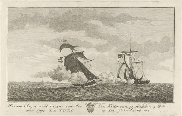 Editor: So, this is "Gevecht tegen vier loggers, 1782," or "Battle Against Four Loggers, 1782," by Hendrik Roosing. It’s an engraving. There’s so much turbulence visualized here—between the ships, the smoke, and those heavy clouds. I'm wondering what stories are embedded in an image like this? How would you interpret it? Curator: Considering it from a historical viewpoint, it captures not just a naval skirmish, but a moment laden with socio-political implications. Prints like these often served as visual propaganda. Notice how Roosing depicts the battle. Do you think it's trying to glorify the event? Editor: Well, the word "Hardnekkig," or "stubborn" is in the caption, which suggests pride. Was there a broader meaning that people would understand at the time? Curator: Exactly. These depictions often played a crucial role in shaping public perception. These were often commissioned and widely distributed. Think about how a seemingly simple battle scene like this contributes to national identity and validates specific political agendas through visual storytelling. Who was this Capt. Le Turc? Do some research, you may find this work immortalized someone who was previously rather obscure! Editor: That makes a lot of sense. I guess I was seeing the aesthetic qualities first. I now realize that the image's public function really shaped its message. Curator: Precisely. Studying the image, it’s important to view it not as an isolated piece, but as part of a broader system that promotes national pride and political legitimization. That’s the lens that tells us about society at the time. Editor: Thanks, I’ve never thought about prints in exactly that way before! It gives me so much to think about!