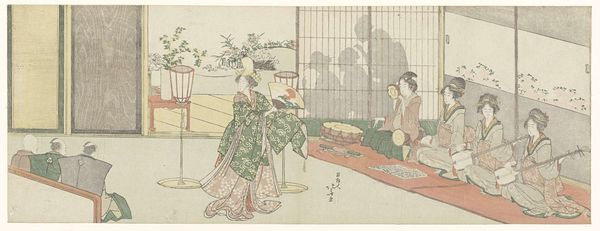 Hosoda Eishi created this woodblock print triptych called "Vrouwen in een openlucht kamer" – or "Women in an outdoor room" – during the Edo period in Japan, a time of relative peace and flourishing arts. Eishi, born into a samurai family, brings a refined sensibility to this intimate depiction of women, likely courtesans, engaged in leisurely activities. We see them in various poses – conversing, writing, and simply enjoying each other’s company. The setting, an outdoor room, blurs the boundaries between private and public, reflecting the complex social roles of women during this era. Confined, yet powerful, and often highly educated and influential, especially within the pleasure quarters. What strikes me most is the quiet, almost meditative mood. The delicate lines, the soft colors, and the attention to detail in the women's kimonos create a sense of beauty and tranquility. This work offers us a glimpse into the lives of women in 19th century Japan, inviting us to reflect on their experiences, their constraints, and their quiet acts of resistance.