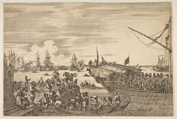 This print, "Selling Fish at Scheveningen," was created by Quentin Pierre Chedel, an 18th-century French engraver. Chedel made it after a painting owned by the Comte de Vence. The scene depicts a bustling fish market on the beach at Scheveningen, now a seaside district of The Hague. In the 18th century, the Dutch Republic was a major maritime power, and fishing was a crucial part of its economy and culture. This image offers a glimpse into the lives of the working class, showing men and women engaged in the labor of selling fish. Notice the contrast between the working people on the beach and the wealthy individuals arriving in carriages, or on horseback. Chedel's print reveals the class divisions that characterized Dutch society at the time, while also highlighting the central role of women in the fishing trade. The print serves as a reminder of the complex social and economic forces at play in 18th-century Europe, where the sea was both a source of life and a site of labor.