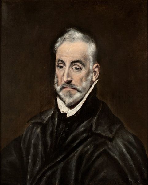 Editor: Here we have Velázquez’s "Portrait of a Cleric" from 1623, rendered in oil. I'm immediately struck by the somberness. How would you interpret this work? Curator: That somberness you're picking up on is really interesting when we consider the intense socio-political landscape of 17th century Spain. Clerics, particularly those connected to the Spanish court, wielded significant power. Do you see how Velázquez captures the sitter's gaze? It’s direct, almost challenging. This suggests to me not just piety, but authority. What is he trying to tell us about this man's place in society? Editor: He does seem to be holding back, keeping secrets. The direct gaze, like you mentioned, is intriguing because he seems to be questioning the viewer at the same time. Curator: Exactly! Think about the Inquisition, the complex relationships between church and state. This cleric's expression becomes a reflection of those tensions, right? It encourages us to question not only his individual identity but the larger system of power he represents. How might we read his clothing, the severe dark robe, within that framework? Editor: It speaks to austerity, but I’m wondering now if it also works to conceal more than it reveals. Thank you, I see so many new layers in this portrait now. Curator: Absolutely. Art enables us to excavate those hidden layers. Looking at this cleric through a lens of power and social context really enriches the way we view Baroque portraiture.