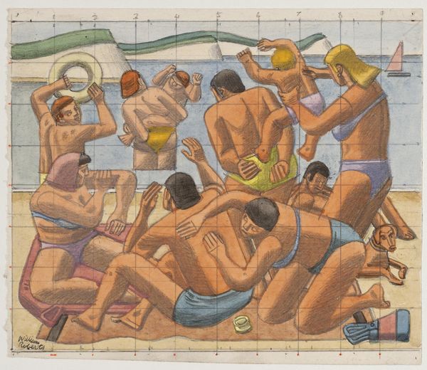 Editor: Here we have William Roberts' "The Isle of Lesbos," held in the Tate. I’m struck by how stylized and almost dreamlike it feels. What do you make of it? Curator: Dreamlike is a lovely way to put it. I see Roberts playing with classical themes – the female nude, the idyllic landscape. It almost feels like a memory of a classical painting, doesn’t it? But with a distinctly modern twist. Editor: I see what you mean. What about those thick, looping cords they're holding? What do you think they symbolize? Curator: Ah, the million-dollar question! Could be anything from playful decorations to restraints, perhaps hinting at the complexities of female relationships. I think Roberts wants us to ponder that ambiguity. It’s the mystery that makes it sing, don’t you think? Editor: Definitely something to think about. Thanks for sharing your insight! Curator: My pleasure! It’s always fun to unravel a little mystery together.