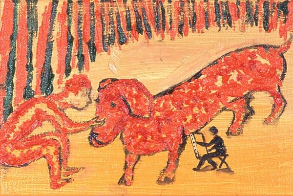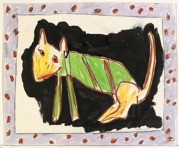 Editor: Here we have Enzo Cucchi's "Caccia del poeta," or "The Poet's Hunt," created in 2007 using ink and drawing techniques. It reminds me of outsider art, with its slightly raw, expressive style. What catches your eye when you look at this piece? Curator: The starkness of the ink, combined with that field of color washing over the dogs, draws my attention immediately. It isn't just *what* is represented, but *how*. Look at the quick, almost frantic strokes. It points to the labor involved, the immediate physical act of creation. It’s about the material transformation of thought into image, wouldn’t you agree? Editor: Absolutely. There's a real physicality to it. Does the title “The Poet’s Hunt” add another layer? Curator: It does, particularly if we consider the means of production, not just in terms of art, but poetry too. Hunting, both literally and metaphorically, is a form of labor. The "poet" then becomes the object being hunted in this scene of material and labor exploitation. Consider the socio-political climate of Italy at the time of its making; do you feel that context enhances or shifts the understanding of the artwork? Editor: I see what you mean! That tension between the act of creation and the underlying context changes the way I see the image, from something spontaneous to something more deliberately constructed. Curator: Precisely. It makes you question what it costs, in every sense, to make art. This process dismantles the idea of some pure creative act, focusing us instead on the reality of material production and social implications. It leaves an intriguing message, don’t you think? Editor: It certainly does! This makes me realize there’s much more than meets the eye. I will be paying closer attention to the 'how' and 'why' when observing art now.