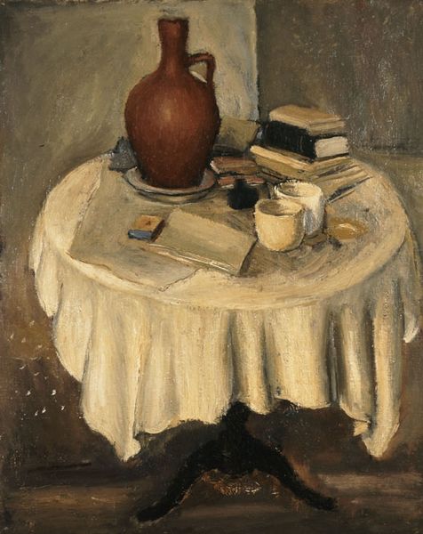 Editor: Here we have Cézanne's "Still Life with Commode," currently housed at the Harvard Art Museums. It has such a domestic feel to it. How does it fit into the narrative of still life painting? Curator: Cézanne challenged traditional still life. The composition, while seemingly simple, is radical. Notice how the commode acts less as a backdrop and more as an active participant. It mirrors the curves of the fruit and the pottery, creating a dialogue between the domestic space and its objects. Editor: So, it's about elevating the ordinary? Curator: Precisely. Cézanne was interested in the politics of seeing, in presenting everyday objects not as passive decorations but as active signifiers within a social space. The painting asks us to consider what we value. Editor: That's a really interesting perspective; I hadn't considered it that way before. Curator: Thinking about the painting's original context, it would have been seen as a bold departure from academic art. Now, it invites us to rethink our own relationships with the objects that surround us.