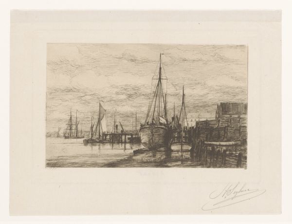 Curator: Before us is "Little Quimper," an etching crafted by Charles Adams Platt in 1883, now residing here at the Minneapolis Institute of Art. Editor: Quimper! Makes me think of weathered docks and salty tales—you can almost smell the brine just looking at the piece, despite the sepia tones. The main thing you see at first glance is a ship berthed with masts climbing like a spiderweb over the skyline. It definitely catches the eye, creating that nautical, vintage feel. Curator: Note how Platt masterfully utilizes the etching technique, employing densely packed lines to construct form and texture. Consider, in particular, the visual weight accorded to the ship docked in the foreground versus the distant cathedral spires. There is a semiotic tension in that dichotomy. Editor: See, it almost feels like a dream you’d have after reading Melville, where the city in the background becomes a haunting phantom. It does capture how memories blend – like looking at Quimper, but only half remembering it. I feel that the mood comes from the detail shown on the ship as opposed to the city. The contrast of crisp boat next to fuzzy spires captures memory as well as place. Curator: Indeed, and the composition reveals a careful balance, steering clear of stark asymmetry through the considered placement of visual elements, and notice how the reflection on the water also suggests formal mirroring. The water provides not only atmosphere but also a point of perspective. Editor: The reflections dancing on the water almost turn the world upside down—as though a memory were reflected back at you from the past. To me it almost captures those blurry feelings associated with coming home, those intangible, melancholic notions when familiar locales take on a fresh look with strange contours. Curator: It certainly holds a nostalgic allure. What strikes me is the level of technical skill Platt used to convey a complex sense of light and depth. A delicate study, a work pregnant with compositional integrity. Editor: It makes you wonder what Platt felt staring out into that harbor! It must have felt like glimpsing his own fleeting reflection. Anyway, I suppose now others get a glimpse of theirs.