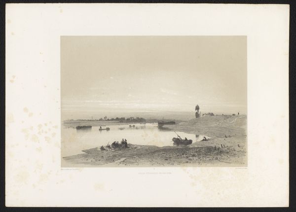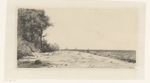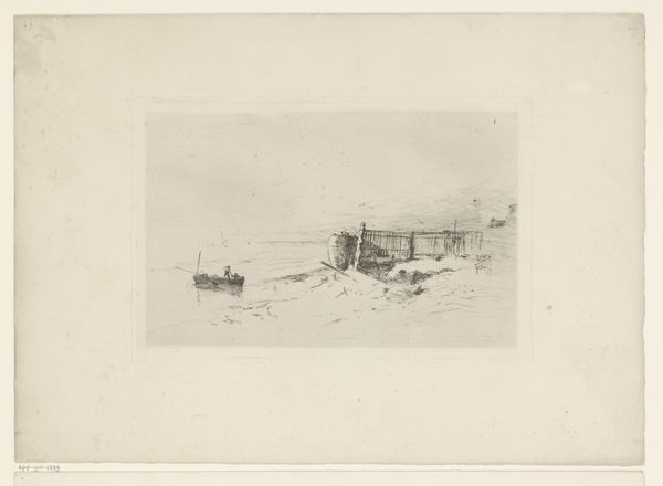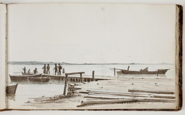 Editor: This is Charles Calvert's "Coast Scene," a small ink wash drawing. It has this quiet, almost melancholic feel to it. What strikes you most about this piece? Curator: I'm drawn to the figures. They seem almost erased by the landscape. This resonates with how marginalized communities, particularly those reliant on natural resources, are often rendered invisible in broader historical narratives. What do you make of their placement? Editor: I guess they seem dwarfed by the scene, but necessary to understanding it. I hadn't thought about it in terms of visibility before. Curator: Calvert might be subtly commenting on the social hierarchy of his time. Landscape painting often served to celebrate ownership and power. Is he challenging that tradition by focusing on labor? It's definitely something to consider. Editor: That's a powerful way to frame it. I'll have to rethink how I approach landscapes from now on. Curator: Exactly! Art reflects and shapes our understanding of the world. Considering who is seen, and who isn't, is crucial.