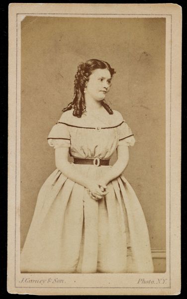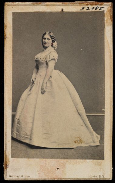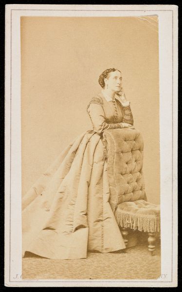 Editor: This is "Mrs. John George Woods," an albumen print created by Jeremiah Gurney sometime between 1858 and 1869. The subject's dress just overwhelms the image. What can you tell me about this work? Curator: This image speaks volumes about the role of women in mid-19th century America, and how the camera further codified restrictive social roles. Consider how Mrs. Woods is presented: draped in an elaborate dress that symbolizes domestic confinement and wealth as a measure of social status. Doesn’t it feel like the dress is consuming her? Editor: I see what you mean! The dress is definitely the focal point, not Mrs. Woods herself. Was this a common aesthetic? Curator: Exactly. The aesthetic was deliberate. This was during an era where a woman’s identity was intrinsically tied to her husband's status and her ability to maintain a respectable household. The photograph isn't just a portrait; it's a performative act that visually reinforces the era’s prescribed gender roles. It invites questions about power, representation, and agency, even in what seems like a simple portrait. Don't you find something unsettling about the limited agency Mrs. Woods appears to possess? Editor: Absolutely, I hadn’t considered the politics of portraiture, how they reinforce societal power structures. Curator: Photography became another tool to uphold certain patriarchal norms. So when we consider a piece like this, we also need to consider whose gaze it serves and whose story gets amplified. Editor: That's a perspective shift for me. I’m now viewing these photographs through the lens of gender and power. Curator: Precisely. And that’s where art history becomes truly fascinating: in unearthing these buried narratives and reclaiming perspectives.