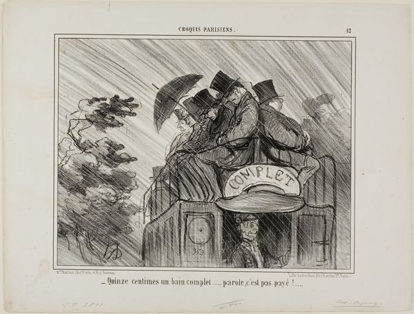 Curator: Here we have Honoré Daumier's "Fifteen cents a complete bath...My word of honor, this is not payment." Editor: My immediate feeling is a sense of dismal saturation. The rain is slashing down, the figures cramped, and the mood is pure drudgery. Curator: This lithograph highlights the socio-economic conditions in 19th-century Paris, commenting on the public's access to basic necessities during a time of rapid urbanization and inequality. Editor: Look at the scratchy, almost frantic mark-making! The lithographic process itself, with its greasy crayon on stone, echoes the grimy reality of seeking a cheap "bath" in that era. Curator: Daumier frequently critiqued the bourgeoisie, and here he uses visual satire to show how even a low price can be exploitative or inadequate. Editor: The word "Complet" emblazoned on the vehicle emphasizes this sense of full, overflowing misery—they're packed in like commodities. Curator: Exactly. He exposes how the promise of cheap services barely masks the grim realities of the working class. Editor: It’s a powerful indictment of a society where basic hygiene becomes a luxury, laid bare through the very labor-intensive process used to create the image itself. Curator: A stark reminder that the cost of living often exceeds what one can pay, in more ways than one.