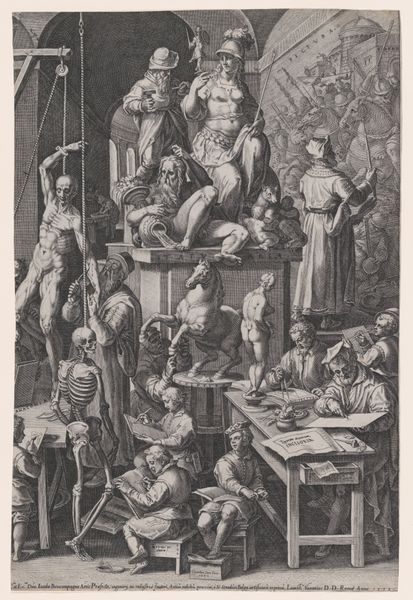 Curator: Let’s consider Carl Russ's "Allegory of Art: A Youth Inspired by the Spirit of Art," an etching from 1810. It’s quite the neoclassical statement. Editor: Yes, the print depicts a scene of muses and a winged figure, clearly referencing classical imagery, but it's all rendered in stark black and white, which feels so different from many paintings of the period. What do you see in this piece? Curator: For me, this image embodies the early 19th-century struggle to define art's role in a rapidly changing society. Notice the juxtaposition of figures associated with traditional art forms and those hinting at nascent sciences and philosophies. Consider how the piece speaks to the intersection of art and intellect and the power dynamics embedded within the classical themes it evokes. Are we looking at an inclusive vision of artistic inspiration, or a more prescriptive one? Editor: Prescriptive in what way? Curator: Well, who is being ‘inspired’ here, and by whom? The central youth is passive, almost swooning, while the muse figure actively touches him. Could we interpret this as a comment on the access to education or privilege inherent in accessing artistic or creative legitimacy in the early 19th century? Consider the political and social realities of the time; how does this imagery function within those broader contexts? Editor: That is very interesting, considering who was afforded education in this historical context. It certainly pushes us to reconsider the scene's narrative beyond a simple depiction of inspiration. Curator: Exactly. Art doesn't exist in a vacuum. Exploring those layers is vital to truly understanding its meaning and its impact on us today. Editor: Thank you! Considering that perspective truly enriches my view of neoclassical art and this work. Curator: Likewise! Considering art from intersectional perspectives broadens our understanding of it.