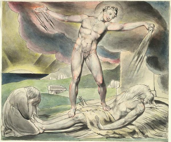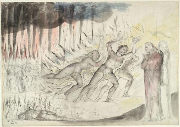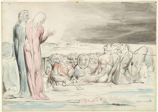 Curator: William Blake’s watercolor work depicts Dante and Virgil in the Skiff of Phlegyas being hailed by Filippo Argenti, an illustration inspired by Dante’s Inferno. Editor: The muted grays and blues create such a bleak, unsettling atmosphere. The frenzied figure emerging from the water adds a stark note of anxiety against the stoic figures in the boat. Curator: Blake's use of watercolor is fascinating here, using thin washes to create a sense of spectral presence and the shifting boundaries between the physical and spiritual realms. It’s a scene of divine justice. Editor: You can certainly see the thematic contrast there, with the dynamism and emotion of Argenti set against the cold detachment of Dante and Virgil. The stark, minimalist style also reflects the bleakness of the narrative. Curator: Consider, too, that the figure of Filippo Argenti might represent the sin of wrath, a destructive force within the human soul. Blake uses Dante's imagery to explore deeper psychological truths. Editor: It’s an intriguing interpretation. Ultimately, the starkness and lack of detail truly amplify its emotional power. Curator: Indeed, Blake’s work invites us to contemplate the complexities of the human condition and the enduring power of symbolic imagery.