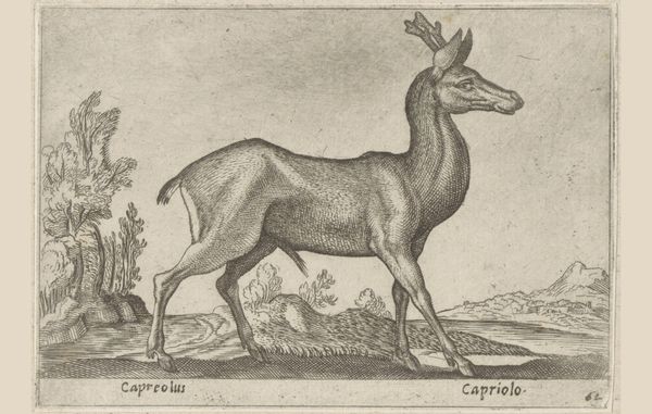 Curator: This is "Hinde," an engraving crafted by Antonio Tempesta, sometime before 1650. You can find it here at the Rijksmuseum. Editor: My initial impression is... awkward. It's this blend of serenity and slight distortion, almost like a dream where things are familiar, but just off. Curator: The "awkwardness" you perceive could stem from the fact that Tempesta, like many artists of his era, sometimes prioritized symbolic representation over strict anatomical accuracy. Editor: Symbols like? Curator: The deer or hinde, for instance, it is a multifaceted symbol. In classical times, it was linked to Diana, the huntress, embodying both grace and swiftness. Medieval Christian art associated it with piety and religious devotion, due to Psalms stating that, as the deer yearns for water, it desires the divine. The context changes its symbolic heft considerably. Editor: It does look like something escaped from a bestiary, doesn't it? Those tiny, meticulously drawn landscapes receding behind the almost comical bulk of this central deer...it’s like two worlds colliding on one plane. Curator: These types of prints often served didactic or ornamental purposes, weren't necessarily striving for photographic realism. They acted as source material. Notice the inscription, 'Cervus'. Its part scientific classification and part allegorical prompt. Editor: The 'old engraving style,' as the museum records note, definitely plays into this sense of antiquity. Those crisp lines, the hatched shading... it’s all a conscious nod to artistic tradition, yet simultaneously it kind of underscores how "unreal" this deer looks, almost like taxidermy. Curator: And in Baroque fashion, everything, including animals, become dramatic agents in a larger historical painting unfolding within human drama. This print is from an era obsessed with classifying the world, encoding morality lessons. The deer stands for far more than what meets the modern eye. Editor: Considering all of that really does enrich what at first I thought was just a quaint, strange, depiction. Now, I get a stronger feeling of it as a snapshot of a world trying to make sense of itself. Curator: Indeed. The artwork beckons viewers into a narrative woven from culture, faith, and visual language.