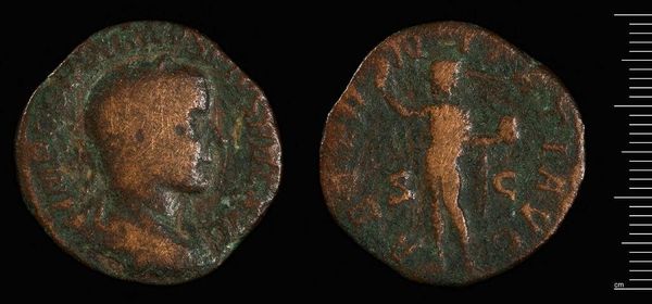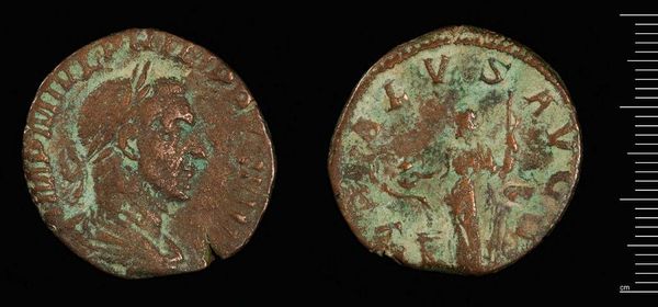 Curator: This is a sestertius, a Roman coin, bearing the image of Emperor Trajan Decius. Its bronze surface is marked by time, yet it offers a glimpse into the visual language of power. Editor: The patina evokes such a sense of age, doesn’t it? It feels like holding a piece of history worn smooth by centuries of handling and exchange. Curator: Indeed. The coin’s imagery served as propaganda, circulating the emperor’s likeness and projecting Roman ideals throughout the empire. Editor: I see a figure on the reverse side—possibly a deity? Coins were often miniature stages for expressing cultural values and aspirations. Curator: Precisely. This particular imagery can tell us about the values Trajan Decius sought to embody, and how he wished to be remembered by the populace. Editor: It's fascinating to think how a small object like this could shape perceptions of leadership and empire across vast distances and generations. Curator: Ultimately, this coin acts as a vital artifact, revealing how power was visualized and disseminated within Roman society. Editor: Yes, and it demonstrates the remarkable potency of symbolic imagery to convey meaning, even millennia later.