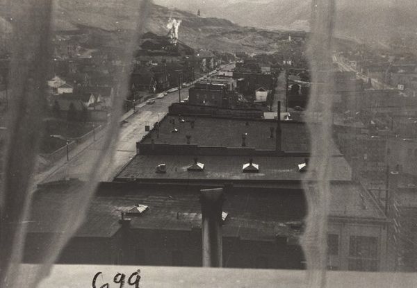 Curator: Robert Frank’s 1956 gelatin silver print, "Rooftops from hotel window--Butte, Montana", captures a moment seemingly caught between industry and nature. What strikes you most when you look at it? Editor: The overwhelming feeling is one of muted darkness, a landscape layered in grays, even the mountain range seems subdued by the urban sprawl encroaching below. It really does bring home to me a sense of how our labor is so heavy upon the land. Curator: That darkness is interesting, especially when we consider Frank's project as a whole. He was deeply embedded in documenting the American experience, a nation grappling with its identity amid postwar industrialization. Butte, Montana, was historically a copper mining town, which heavily dictated its socio-economic realities, as we can see expressed so bluntly in this capture. How does it influence our perception? Editor: The photograph certainly reveals much about the labor history and social dynamics inherent in that town's architecture. See how those solid, dark roofs, factories most likely, are situated much more prominently than the more faint mountain landscape lurking at the picture’s edges? Curator: Indeed. This visual choice highlights the dominance of industrial labor. The rooftops appear almost like monuments, yet the grittiness of the print itself reveals their lack of refinement or grandeur, and more so their almost depressing function, as sites for labor. Do you believe this industrial perspective is being interrogated, here, in the historical capture of Butte? Editor: Definitely. Frank doesn't romanticize industrial production. He’s looking squarely at the constructed landscape and implicating, almost accidentally through its framing, how integral labor becomes to that construction. Curator: Yes, there's a real dialogue between Frank's individual experience and the much wider themes of capitalist society on display, specifically what a society in transition to mass modes of production looks like and its effect on natural resources. Editor: Exactly, there’s an awareness of how intertwined everything is here: the mining town's economy, its social hierarchies, the visible marks left upon its physical setting. The materials of labour are the actual materials with which the image comes into being. That the print itself is silver is not just ironic. Curator: I think for me it speaks volumes about the period of time during which the picture was taken, and that crucial understanding is central. It certainly resonates in how we, ourselves, find dialogue with similar spaces today, that is also of course mediated through identity and production, albeit a very new version of these themes. Editor: I agree, a stark photograph. And certainly its somber qualities remind us about labor’s crucial role within cultural constructions.