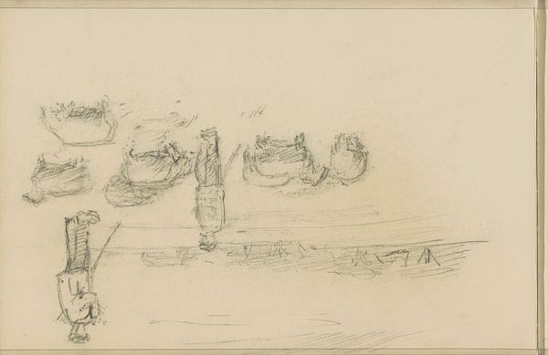 Curator: Anton Mauve created this pencil sketch, “Sheep near a Hut with a Pointed Roof,” sometime between 1848 and 1888. It’s currently held here at the Rijksmuseum. Editor: Immediately striking is the subdued, almost ethereal quality of the piece. The stark lines create a feeling of gentle transience, like a memory fading at the edges. Curator: Indeed, Mauve's expert use of pencil lends itself to this ephemeral feeling. The composition, too, reinforces this. We can see the artist is deploying a limited range of tonal values to describe this landscape, this almost makes the work dream-like. How might such a depiction have resonated with contemporary audiences? Editor: Considering the sociopolitical environment of the time, with the rapid rise of industrialization, Mauve’s work could be interpreted as an idyllic representation of the traditional rural life increasingly threatened by modernization. The imagery presents a curated vision that many desired, the sheep represent innocence. Curator: And this focus on the simplicity of form contributes to the subject. The gestural lines that create these soft bodies is really something! What do you feel it tells us? Editor: I see Mauve's concentration on capturing the fleeting moment speaks to a growing yearning for simplicity amidst societal transformation. Artists became increasingly motivated to portray and preserve pastoral traditions that industrial life risked erasing completely. Curator: That’s quite insightful. His artistic style creates not only visual interest but prompts consideration of broader shifts in cultural and societal norms. I will consider it in a broader perspective. Editor: It will allow others to see these pencil strokes as something more potent, something capable of holding and reflecting significant meaning.