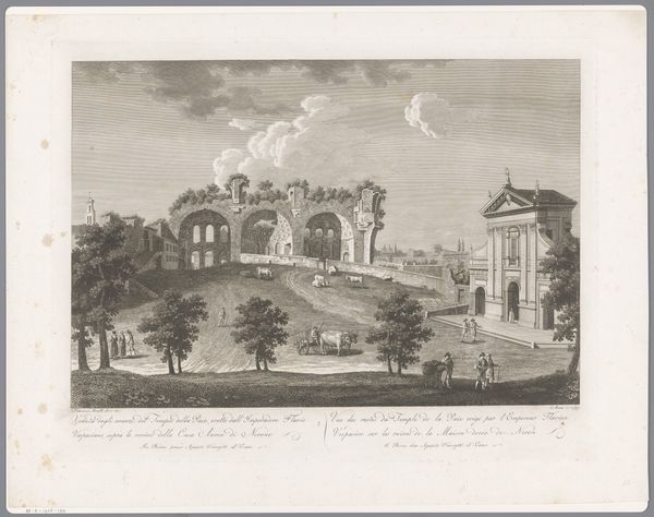 William Woollett created this print, "View of West Wycombe Park," using etching and engraving. At first glance, the classical architecture and verdant landscape exude a sense of serene formality. The structure of the work employs linear perspective to draw the eye toward the grand house, anchoring the composition. However, the interplay of light and shadow destabilizes a purely idealized reading. Woollett uses a semiotic language, contrasting the man-made order of the architecture with the natural forms of the trees and sky. This contrast creates a dialogue between control and the uncontrollable. The figures, carefully placed, further serve as signs, mediating between the viewer and the depicted space. Consider the delicate balance Woollett strikes between representation and abstraction. The print invites contemplation not just on what is seen, but also how it's seen, challenging the viewer to reconcile aesthetic pleasure with deeper philosophical questions.
