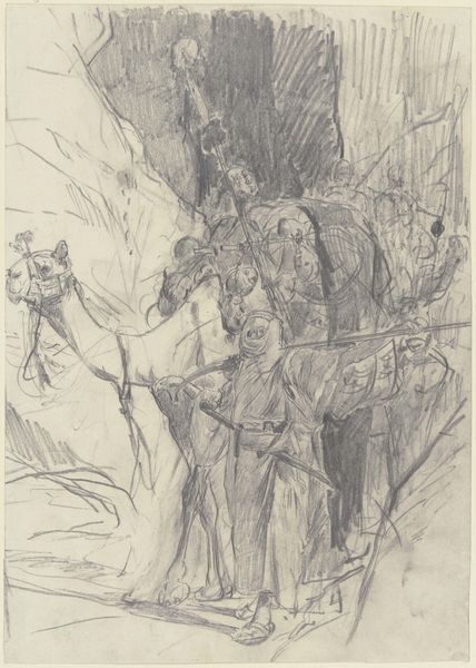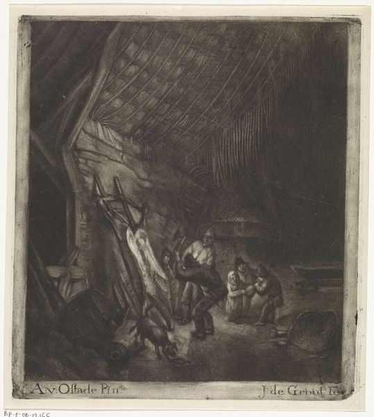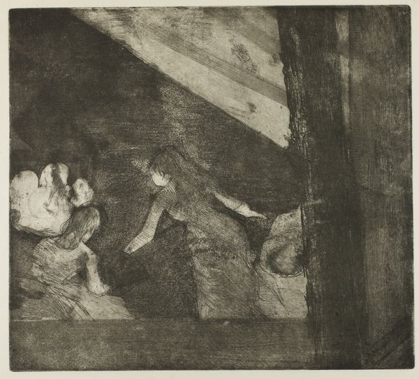 Editor: Here we have Marcel Roux's 1910 print, an etching in ink on paper titled "Spiderweb with anthropomorphic spider capturing a man". It's immediately striking – unsettling, even, with that nightmarish scene rendered in stark black and white. The detail is incredible. What do you see in this piece? Curator: It speaks of primal fears, doesn't it? That age-old dread of the unknown, the lurking predator. I find myself pondering the symbolism; the spider, often a feminine archetype, here traps the masculine. A Freudian feast, perhaps? Do you feel the composition amplifies the tension? That web isn't just a trap; it's a cage of anxieties, drawn with incredible confidence using those stark contrasts of light and dark, a signature move within symbolism. Editor: Definitely. It’s like a visual metaphor for entrapment, almost suffocating. It does have this undercurrent of the erotic... I mean, it makes me deeply uncomfortable, yet there is something fascinating at the same time. Curator: It’s a beautiful, terrifying dance, isn't it? Remember, symbolism relished exploring the darker corners of the human psyche, the repressed desires, and anxieties. Consider how the very *process* of etching - the biting of the acid into the plate - mirrors the spider’s venomous bite, slowly claiming its prey. The question I always come back to with pieces like this... where does the spider’s power truly lie – in its physical prowess, or in its ability to manipulate fear? Editor: That’s a fantastic point! I hadn't thought about the process of etching mirroring the spider's venom, it changes my appreciation. It's a visual story that goes well beyond a literal image of capture. Curator: Absolutely. It resonates within your imagination, burrowing deep like a… well, like a spider in its web. Editor: Very true! I'll be seeing spiders a little differently for a while. Curator: Me too. Art has that transformative magic, doesn't it? To alter our perception of the world.