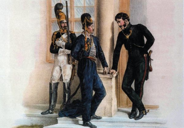 Pierre-Paul Prud'hon captured a moment of diplomacy with oil on canvas in "The Conversation of Napoleon and Francois II". The composition is anchored by three figures in the foreground—two in bright red and white uniforms facing Napoleon in darker clothing. The artist divides the canvas into distinct zones: the figures, a background of indistinct soldiers and trees, and a dramatic cloud of smoke suggesting a battlefield. Prud'hon uses color to create a semiotic system of power and authority. The darker, more muted tones of the background contrast with the brighter colors of the figures, highlighting their importance. The stark light on Napoleon draws our attention to the scene's central figure. The structure of the painting invites us to consider the narratives around power, negotiation, and the theater of historical events. This is not just an image of a moment, but an open-ended question about the nature of leadership and authority.