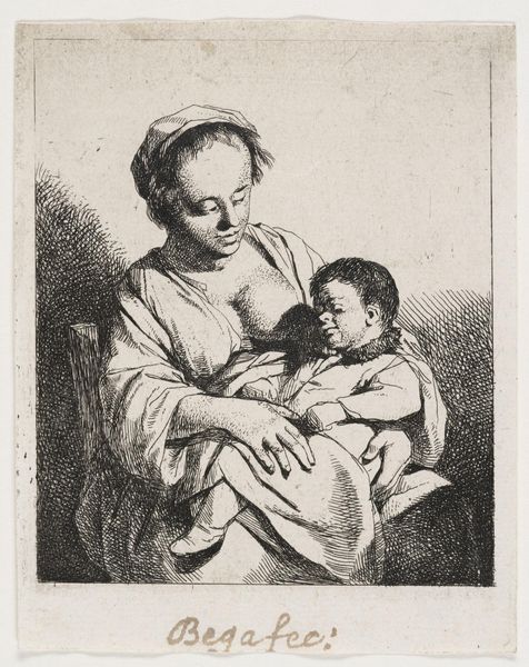 Curator: We are looking at an etching titled "The Mother" by Cornelis Bega. Editor: It's a quiet scene. I’m immediately drawn to the lines—rough, but tenderly defining the figures. What strikes me most is the contrast in tones despite the minimalist palette. Curator: Indeed, Bega's technique here, the etching process itself, emphasizes line and tonal values, achieving volume and depth without color. Notice how the light catches the woman’s face compared to the shadows defining the child's form. The composition is rather straightforward, the figures occupying the center. Editor: To my eye, that positioning is everything! Given the laborious nature of printmaking, one can't ignore that the composition asks viewers to witness the working-class labor inherent in breastfeeding itself, challenging typical classical mother and child art while nodding to it at the same time. What do you think of that idea? Curator: It is an astute observation to consider the maternal and labor aspects, certainly. It's fascinating how Bega uses simple lines to convey the nuances of texture – the smooth skin of the child, the fabric of the clothing. Formally, it seems his priority rests more with highlighting this contrast of smoothness against the more chaotic lines in the background. Editor: The stark black and white of the print only amplify the economic realities of such domestic scenes. The very materials emphasize Bega’s place within a specific artistic labor network—from the etching itself, which speaks to the tools of the trade and skilled craftspeople to the way in which a simple shift of context, from painting to etching, makes the image all the more accessible. Curator: Ultimately, Bega captures the universal theme of motherhood within a carefully balanced, visually appealing frame. It remains a testament to the power of suggestion through form. Editor: I see now the etching does more than present an image. The physical properties invite critical consideration of subject and production both—forcing me to reconcile technique with cultural conditions.