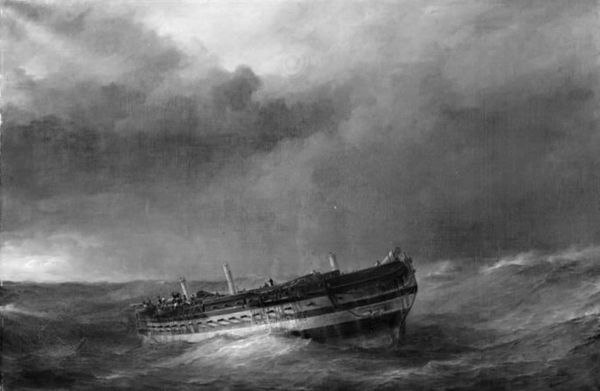 Robert Charles Dudley created "Grappling for the Lost Cable," with grey oil paint. The picture plane is nearly split in half horizontally between the sky and sea. We see two ships, a sky with a half moon, stars, and a shooting star. Through Dudley’s formal treatment, the composition evokes a sense of awe, adventure and perhaps even fear. The tonal range of the gray scale creates volume and dramatic tension. Note how the artist utilized light and shadow to establish a hierarchy, drawing your eye to the larger ship at the center, and then to the smaller ships on the horizons. The shooting star is a dynamic signifier, its form disrupting the grid-like structure of the ship’s masts and rigging, suggesting the unpredictability of nature. Consider too the way Dudley has used the materiality of oil paint. Short, gestural strokes render the turbulent sea, while smoother applications define the metallic structure of the ships. Dudley captures a pivotal moment in maritime history, but also uses formal and material qualities to explore themes of technology versus nature.