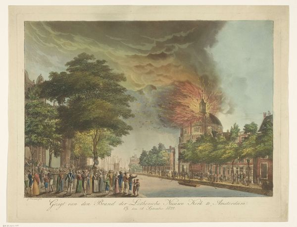 Curator: Editor: Here we have "Ontploffing van het laboratorium in Bergen op Zoom," an engraving from 1831, housed at the Rijksmuseum. It's quite striking; the chaotic scene depicted feels so at odds with the almost clinical precision of the engraving technique. How should we interpret this depiction of what looks like a fairly devastating explosion? Curator: What stands out to me is how the printmaking process itself reflects the industrial and scientific advancements that likely led to the laboratory explosion in the first place. Consider the meticulous labor involved in creating this engraving, each line carefully etched – it mirrors the scientific precision valued at the time, doesn't it? What material conditions facilitated the making and distribution of such prints? Editor: That's an interesting connection I hadn’t considered. It speaks to a wider accessibility to visual media. So, the means of production affect our reading of the image, making us consider the historical and social context of both the depicted event and the artwork's creation. It also pushes us to see art, even history paintings like this, as something crafted from specific materials using very particular, available processes. It wasn't a photograph. Curator: Precisely. Think about the role of the printing press, the engraver’s workshop, the very materiality of paper and ink. These factors influenced who saw this image, and what it meant to them. What do you suppose a wider distribution and lower cost of this medium does to notions of fine art during that period? Editor: So it democratized visual information... And by examining the print as a mass-produced object, we can begin to unpack the social and economic forces at play in early 19th century Netherlands. I suppose looking at how many copies were made, or at variations in printing quality over time, might even reveal different target audiences. I'm really beginning to think about these art objects as cultural commodities. Curator: Exactly! By emphasizing process, materials and their impact, it really does unlock a deeper appreciation of the artwork, far beyond the simple depiction of an event. Editor: Thank you! Thinking of artistic creation in material terms definitely opens my eyes to the wider circumstances surrounding an image like this. I never thought about the cultural implications of engravings before!